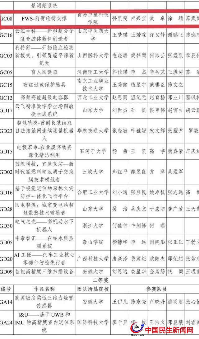 孫凱雯、盧興寶、武卓、徐靖、蘇武博的前臂輪椅支撐項(xiàng)目為學(xué)校爭(zhēng)取到一等獎(jiǎng)的榮譽(yù)。