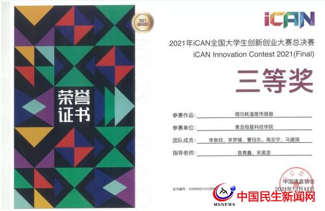 中國(guó)民生新聞網(wǎng)訊 近日,在剛剛結(jié)束的ICAN全國(guó)大學(xué)生創(chuàng)新創(chuàng)業(yè)大賽總決賽中,青島恒星科技學(xué)院參賽團(tuán)隊(duì)榮獲一等獎(jiǎng)1項(xiàng),二等獎(jiǎng)1項(xiàng),三等獎(jiǎng)1項(xiàng)的好成績(jī),突破本賽事歷史最好成績(jī)。