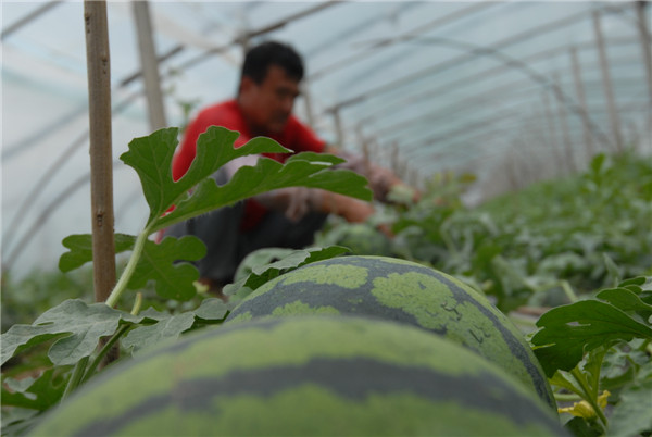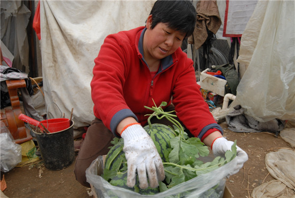 “為了保證西瓜的品質,我們都用有機肥和農家肥,還采用最原始的人工授粉,所以說種西瓜絕對是個苦活,過年都在忙,沒有一天休息的。”孫洪寶笑著說,從頭年11月份開始育苗、嫁接,40天后 栽到大棚里,就一直忙到現在。3月份開始給西瓜授粉,大棚里溫度在 30℃ 到 35℃左右,經常忙完一上午活,身上的衣服就全濕透了,像剛從水里撈出來的一樣。“賣瓜的時候是最開心的, 特別是點錢時心情特別好,感覺所有的辛苦都值得了。”孫洪寶黝黑的臉龐上笑開了一朵花。