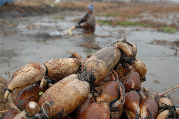 12月2日,寒風(fēng)料峭,冬意濃濃。山東青島市即墨區(qū)靈山街道大河套村的160畝無公害淺水藕種植田里,卻是一派繁忙的景象,一筐筐鮮嫩的藕從秧田里刨出來,被來來往往的車輛運(yùn)走。