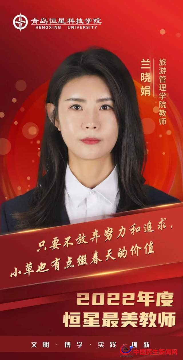 蘭曉娟,中共黨員,研究生學(xué)歷,碩士學(xué)位,副教授職稱,畢業(yè)于中國人民大學(xué),現(xiàn)任青島恒星科技學(xué)院旅游管理學(xué)院教師兼班主任。從事教學(xué)科研工作8年以來,先后主持參與省級科研立項(xiàng)2項(xiàng),校級科研立項(xiàng)5余項(xiàng),發(fā)表論文10余篇,指導(dǎo)學(xué)生參加國家及省市級大賽獲獎30余次,多次獲國家級、省市級“優(yōu)秀指導(dǎo)教師”榮譽(yù)。作為一名優(yōu)秀的“雙師”型教學(xué)能手,先后被學(xué)校評為“優(yōu)秀共產(chǎn)黨員”“優(yōu)秀教師”“優(yōu)秀班主任”。