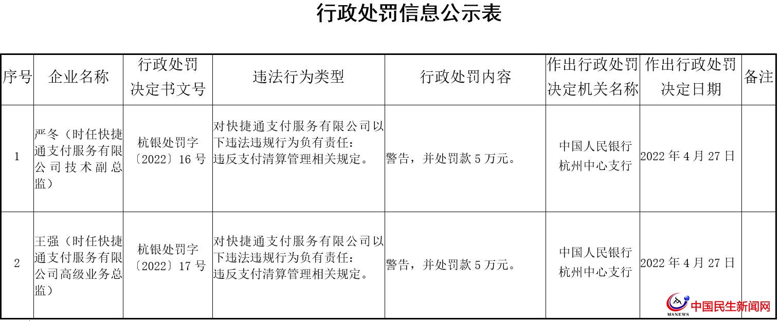 金融虎網(wǎng)注意到,5月10日,快捷通支付兩名管理人員嚴(yán)冬和王強均因?qū)?ldquo;違反支付清算管理相關(guān)規(guī)定”負有責(zé)任,分別被給予警告,并各處罰款5萬元。嚴(yán)冬時任快捷通支付服務(wù)有限公司技術(shù)副總監(jiān),王強時任快捷通支付服務(wù)有限公司高級業(yè)務(wù)總監(jiān)。