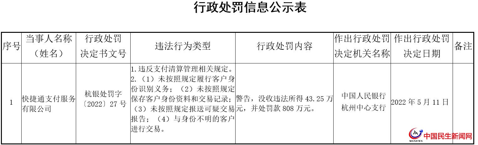 金融虎訊 5月23日消息,近日,央行杭州中心支行公布的行政處罰信息公示表顯示,快捷通支付服務(wù)有限公司因違反兩項規(guī)定被給予警告,沒收違法所得43.25萬元,并處罰款808萬元。
