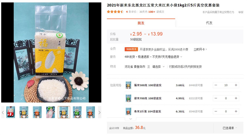 我們在積分商城中隨機挑選了兩款產品分別為寒地硒米及高寒燕麥片,進行了產品信息查詢,中國有機谷積分商城中寒地硒米價格為5000g產品1250元;高寒燕麥片價格為1000g產品189元。但是我們在阿里巴巴電商批發(fā)平臺找到的同款產品,在阿里巴巴上寒地硒米價格為5000g產品13.9元,高寒燕麥片價格為1000g產品8.5元。