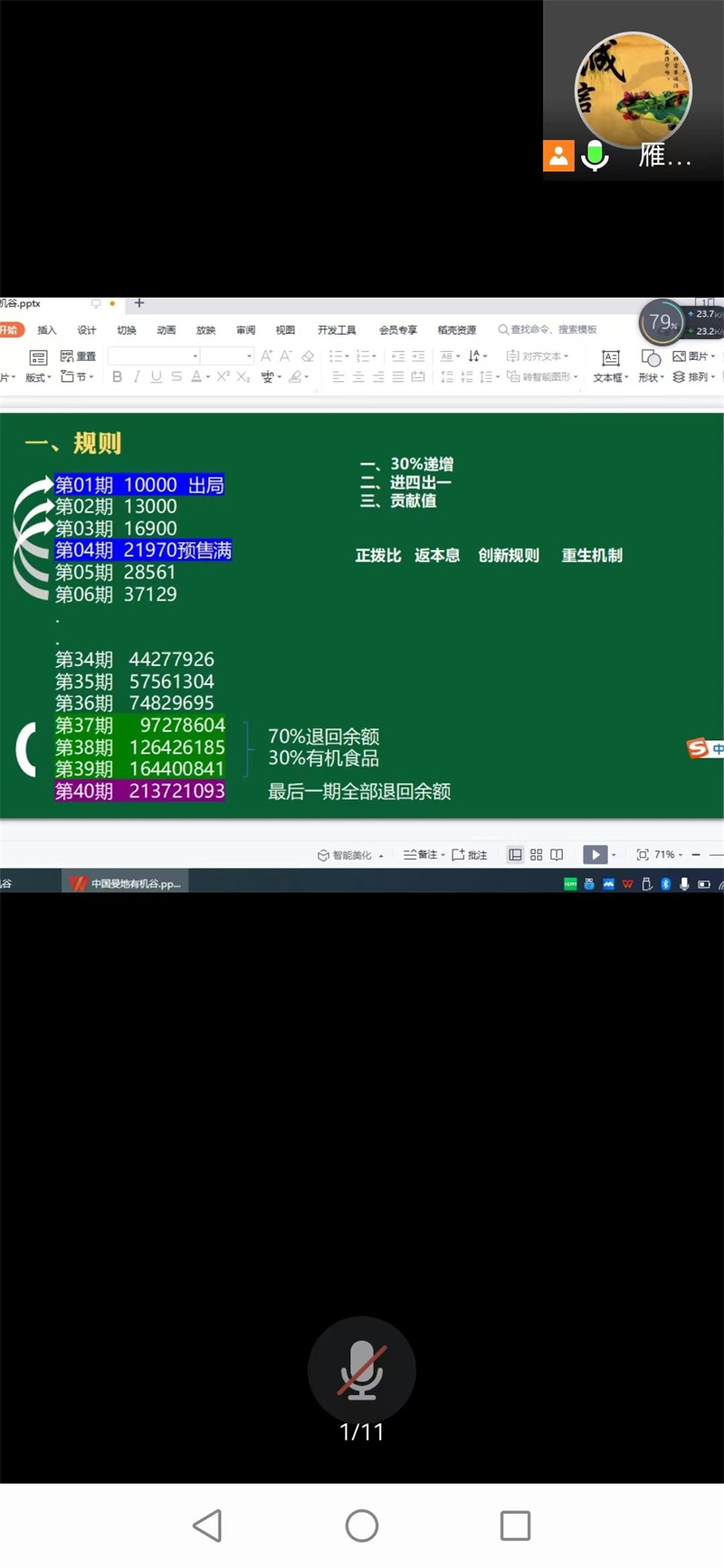 被邀請成為中國有機谷APP注冊會員后即可參與中國有機谷眾籌預售,每輪可眾籌100-5000元,每個預售訂單需消耗參與金額2%的貢獻值,每期眾籌間隔48小時左右,每期眾籌預售均以30%速度遞增,采用進4出1制度,第4期眾籌款滿,結算第1期訂單;第5期訂單結束,結算第2期訂單;第6期訂單結束,結算第3期訂單;結算時返還本金+利潤70%現(xiàn)金+利潤30%產品積分(在積分商城兌換有機產品,均為實價,價格對標京東淘寶實體超市)以此類推,當某期訂單沒有在規(guī)定時間內滿額,系統(tǒng)自動熔斷,當期訂單的參與會員,所有資金原路返回;當期的前三期會員70%訂單金額原路退回+100%產品積分+30%貢獻值。