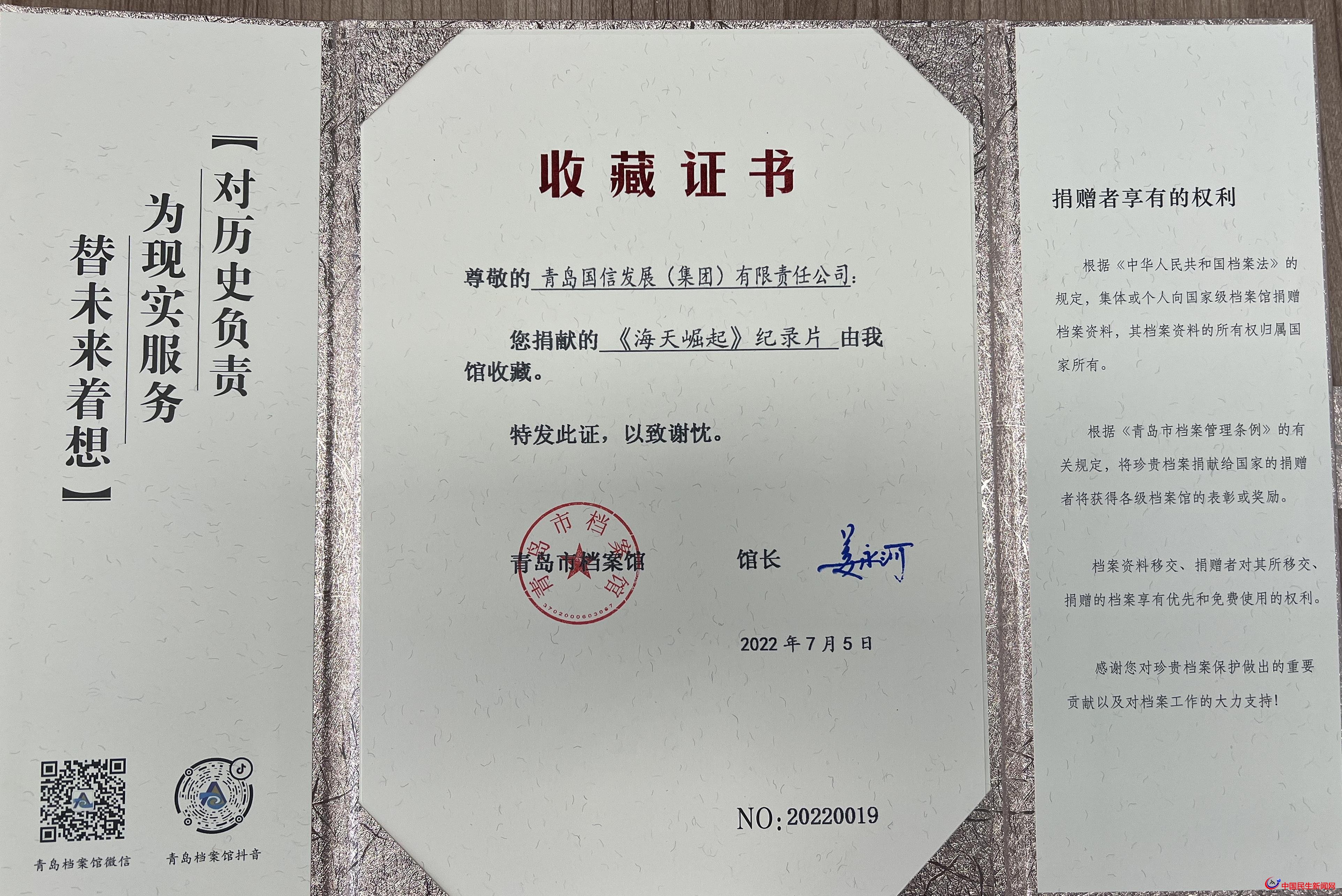 青島快訊 銘記歷史,致敬城市。由青島國信集團旗下國信傳媒和海天中心聯(lián)合出品的大型紀錄片《海天崛起》即日起在中國民生新聞網(wǎng)、騰訊視頻、青島新聞網(wǎng)等20余家媒體和平臺展播。同時,這部長度近一個小時的紀錄片被市委黨史研究院、市檔案館、市城市建設檔案館永久收藏,青島國信集團獲得由官方頒發(fā)的收藏證書。