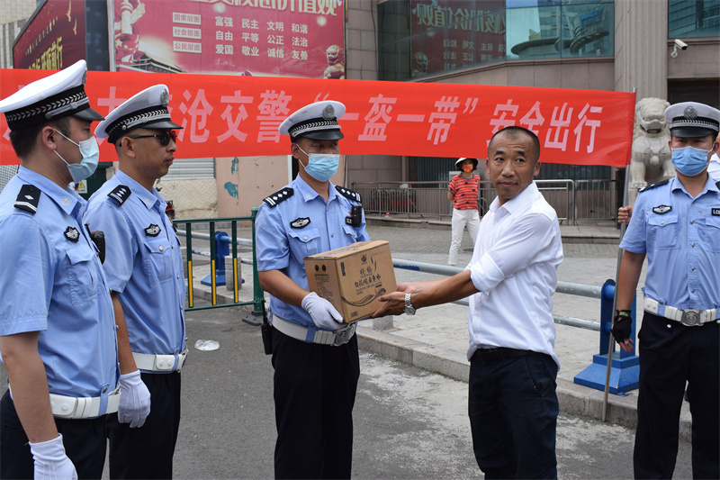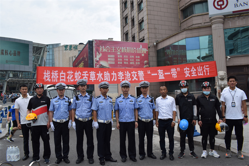 棧橋酒業(yè)贊助了100頂頭盔以及給奮戰(zhàn)在一線的交警捐贈了上百箱棧橋牌白花蛇舌草水,只要交警在路上巡邏時(shí)發(fā)現(xiàn)外賣小哥或者騎電動車沒帶頭盔的騎行者,他們就會及時(shí)讓他們停下來,送上一頂安全頭盔。