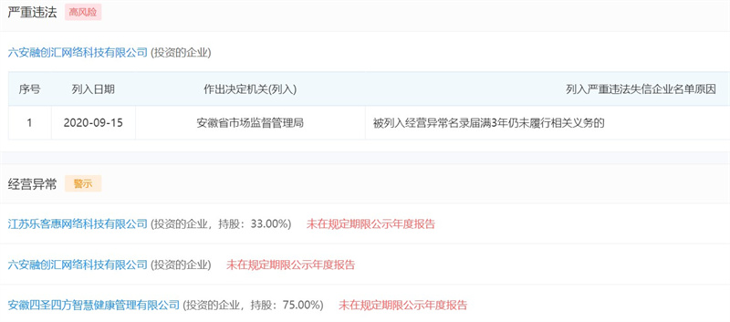 鄧賢炳名下的其他企業(yè)也是問(wèn)題重重,多家企業(yè)因未在規(guī)定期限公示年度報(bào)告而被當(dāng)?shù)乇O(jiān)管部門(mén)列入經(jīng)營(yíng)異常名錄,值得一提的是,由他投資的六安融創(chuàng)匯網(wǎng)絡(luò)科技有限公司更是早已被安徽省市場(chǎng)監(jiān)督管理局列入嚴(yán)重違法企業(yè)名錄之內(nèi)。據(jù)統(tǒng)計(jì),目前由他擔(dān)任法定代表人的企業(yè)共有4家,其中3家已經(jīng)注銷(xiāo);由他投資的企業(yè)共有7家,其中有3家已然注銷(xiāo),還有兩家已處于吊銷(xiāo)的經(jīng)營(yíng)狀態(tài)。