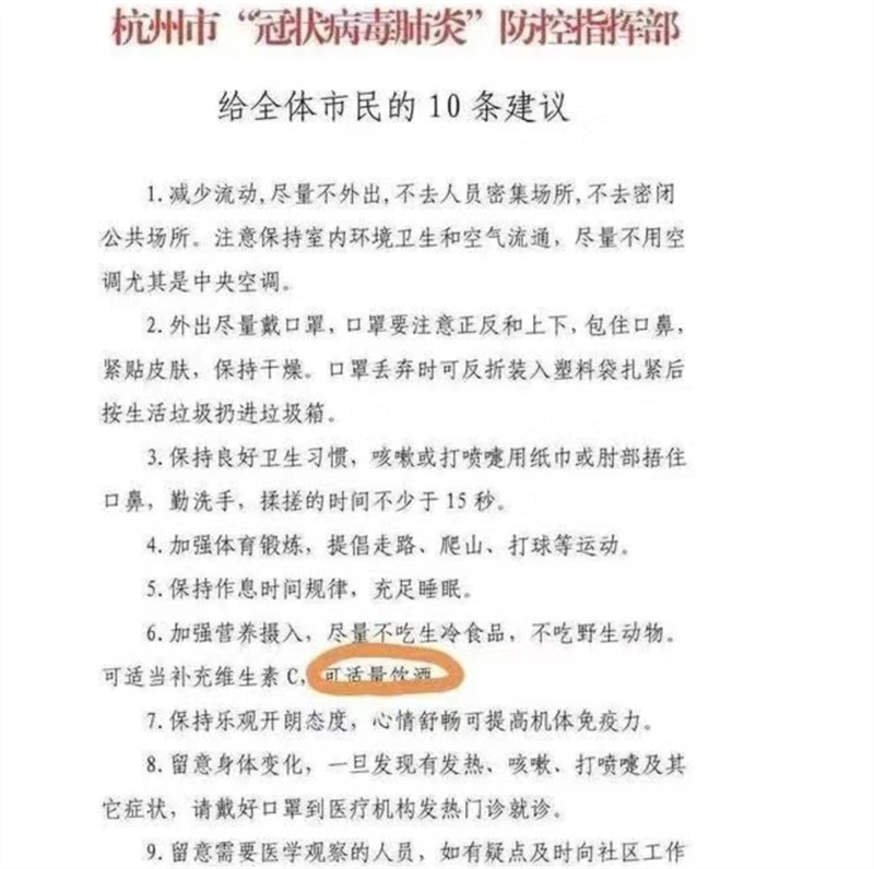 《杭州市“冠狀病毒肺炎”防控指揮部給全體市民的10條建議》第六條寫著“加強營養(yǎng)攝入,盡量不吃生冷食品,不吃野生動物??蛇m當補充維生素 C,