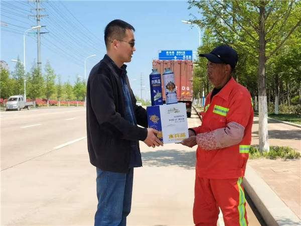 中國民生新聞網(wǎng)訊 (記者 素素)今天上午,在青島西海岸新區(qū)軍民融合區(qū)附近的道路上,一群辛勤打掃馬路的清潔工人收到了一份特殊的“禮物”,青島“水兵藍(lán)”啤酒公司向他們贈送了“五一”節(jié)的禮品。品嘗著沁人心脾的啤酒,他們禁不住豎起了大拇指。