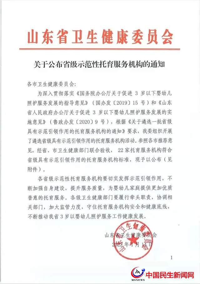 2022年1月14日,山東省衛(wèi)生健康委員會正式確定青島恒星托育中心為“省級示范性托育服務(wù)機構(gòu)”!