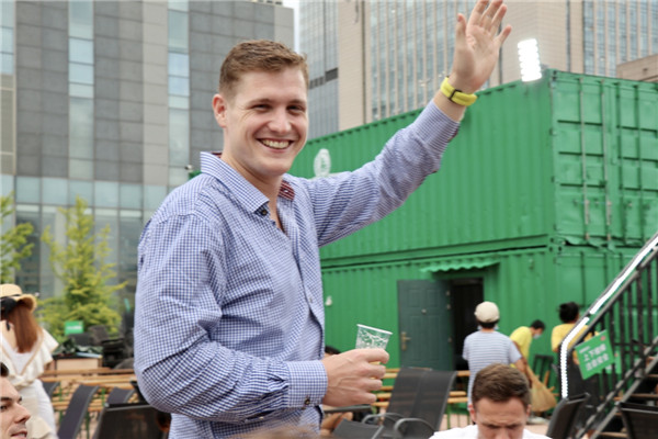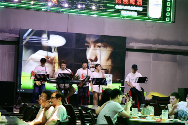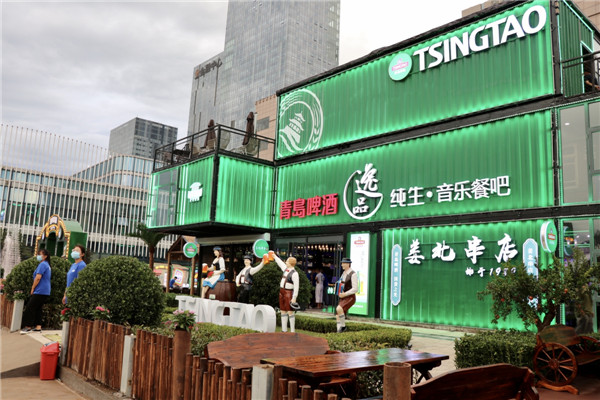花園負(fù)責(zé)人張相田介紹,今年他們?cè)诃h(huán)境打造上極力貼合百年國(guó)潮的主題風(fēng)格,以國(guó)潮風(fēng)+復(fù)古風(fēng)為主進(jìn)行設(shè)計(jì),“我們?cè)谝粯堑氖覂?nèi)空間里用3000余個(gè)廢舊的啤酒瓶打造了一整面背景墻,在二樓,墻面上的老窗戶都是我們從浙江搜集過來的,都是從六七十年代的老建筑上拆下來,在室外,我們用青啤的文化元素打造了一處文化墻。”