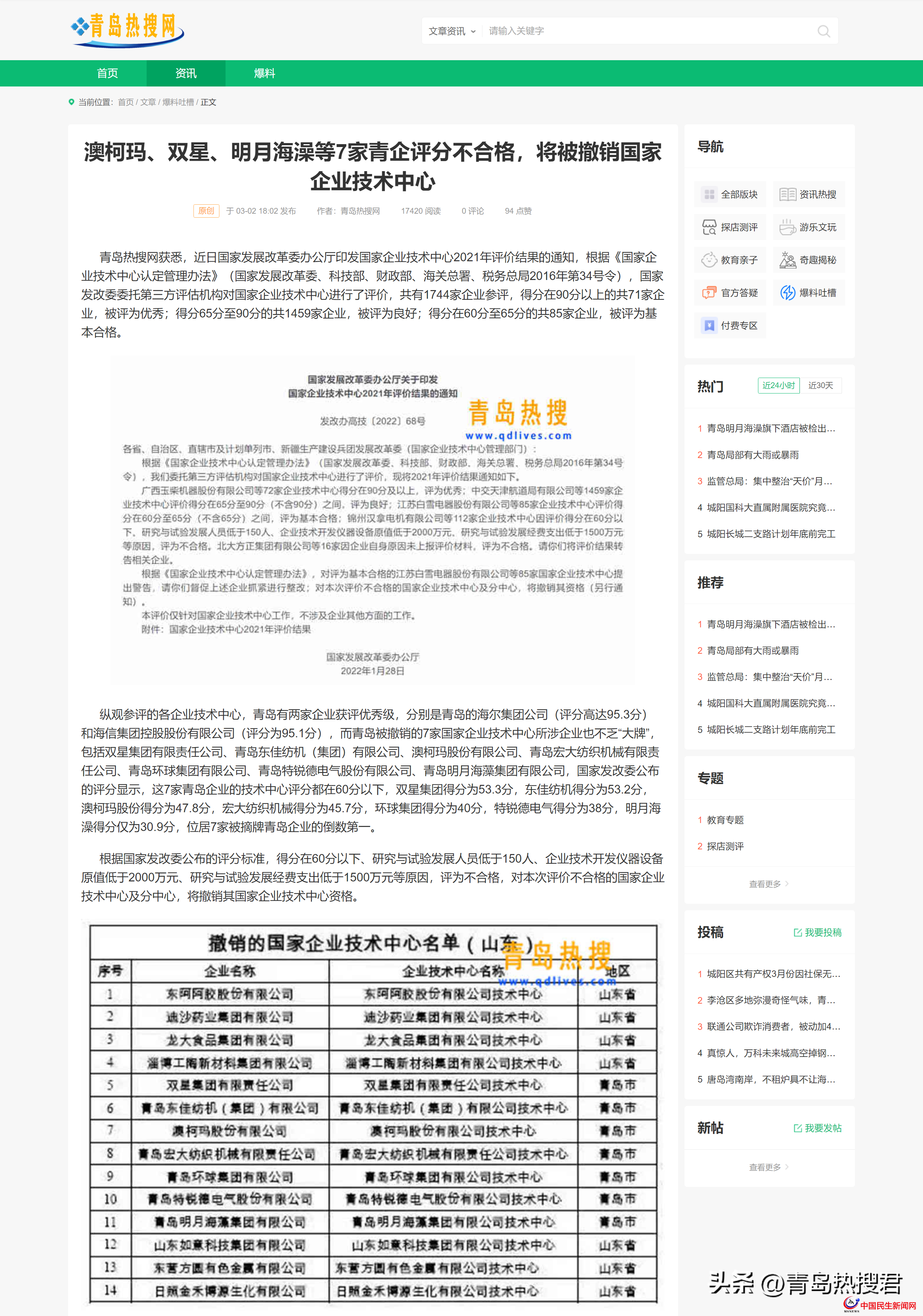熱搜君通過進(jìn)一步查詢發(fā)現(xiàn),號稱“制造業(yè)單項(xiàng)冠軍示范企業(yè)、青島新五朵金花”的明月海藻在今年3月份國家發(fā)改委公布的“國家企業(yè)技術(shù)中心2021年評價(jià)結(jié)果”中被通報(bào)撤銷國家企業(yè)技術(shù)中心資格!明月海藻的綜合評分僅為30.9分,不但成績未達(dá)60分的及格線,而且位列7家被摘牌青島企業(yè)的倒數(shù)第一!