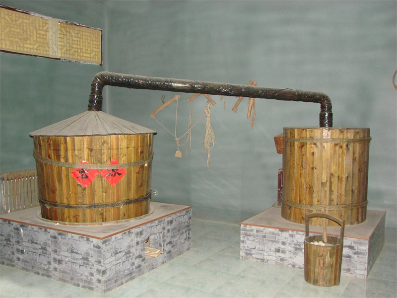 展廳所展示的釀酒器具大都是從不同歷史時(shí)期,宏源酒坊傳承下來(lái)的。卡食罐(用于盛放酒母,培養(yǎng)微生物菌絲之類)、純錫冷卻器(釀酒老作坊里用于蒸餾工藝過(guò)程中的冷卻)、木輪水推車(古代北方農(nóng)具,運(yùn)輸工具)、煙囪(劉子厚的“宏源號(hào)”老酒坊拆遷后所留下)、鼓風(fēng)機(jī)(古代北方農(nóng)具,用于分離糧食外殼)等這