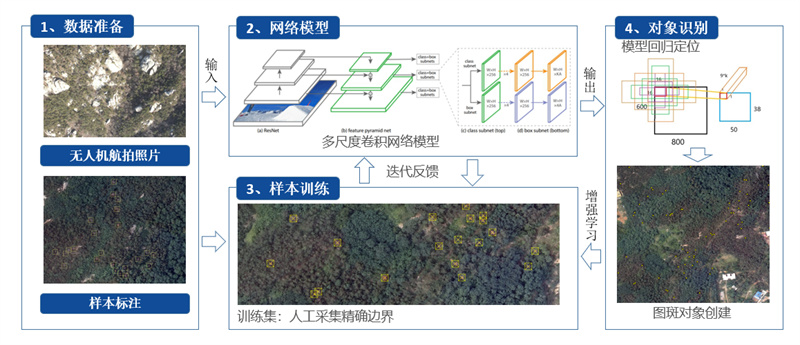 通過監(jiān)測(cè)普查摸清疫情發(fā)生底數(shù)是科學(xué)制定防治方案的前提條件,但常規(guī)普查監(jiān)測(cè)耗時(shí)長(zhǎng)、難度大、成本高,數(shù)據(jù)實(shí)時(shí)性和準(zhǔn)確性也存在一定局限。為進(jìn)一步提升防治能力,貫徹落實(shí)智慧防治理念,由嶗山區(qū)自然資源局、北京航空航天大學(xué)青島研究院聯(lián)合攻關(guān),通過融合0.05米高分辨率無人機(jī)技術(shù)、北斗高精度導(dǎo)航技術(shù)和人工智能技術(shù),對(duì)無人機(jī)獲取的高精度圖片進(jìn)行智能化分析處理,精準(zhǔn)識(shí)別監(jiān)測(cè)松材線蟲病疫情發(fā)生情況,逐步構(gòu)建形成了“精準(zhǔn)監(jiān)測(cè)”“精準(zhǔn)識(shí)別”“精準(zhǔn)評(píng)估”和“精準(zhǔn)監(jiān)管”四位一體的松材線蟲病空天地一體化精準(zhǔn)飛巡監(jiān)測(cè)體系,并申報(bào)山東省自然資源科學(xué)技術(shù)獎(jiǎng)。