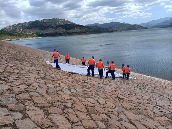 壩前護(hù)坡坍塌滑坡?lián)岆U演練現(xiàn)場,無人機(jī)空中巡檢發(fā)現(xiàn)主壩迎水坡位置出現(xiàn)坍塌滑坡,搶險隊(duì)員立即兵分兩路,一路在迎水坡鋪設(shè)土工布覆蓋滑坡體區(qū)域,用沙袋將土工布壓實(shí),另一路將沙袋搬運(yùn)至吊籠,由吊車將沙袋投放至滑坡體下方,防止坍塌及滑坡進(jìn)一步發(fā)展。經(jīng)過搶險隊(duì)員的共同努力,護(hù)坡坍塌滑坡被及時處置,險情得到有效控制。