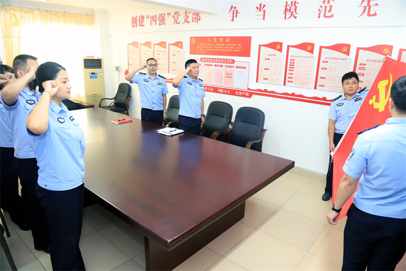 最后,全體黨員民警在莊嚴(yán)的黨旗面前重溫入黨誓詞。誓言句句鏗鏘有力,字字?jǐn)S地有聲,體現(xiàn)了全體黨員民警對(duì)黨的無限忠誠,對(duì)共產(chǎn)主義的堅(jiān)定信仰。