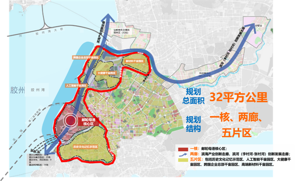 這一區(qū)域位于膠州灣東岸。面向膠州灣,區(qū)域的邊界因此也將膠州灣一代升級(jí)成山東開放發(fā)展潮頭的“黃金海岸”,區(qū)域自身而言也正好形成與日韓交流合作的一個(gè)突破口。