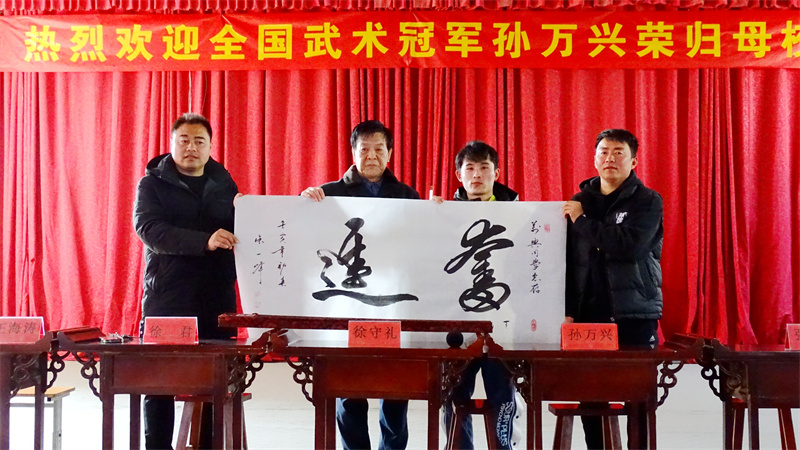 學校董事長徐守禮先生親自向?qū)O萬興同學贈送他的墨寶“奮進”,還贈送了徐學義武學研究院定制珍藏版龍泉寶劍并致辭,號召育才武校學子向他們的學長孫萬興同學學習,志存高遠,刻苦練功,奮進拼搏,為國爭光!