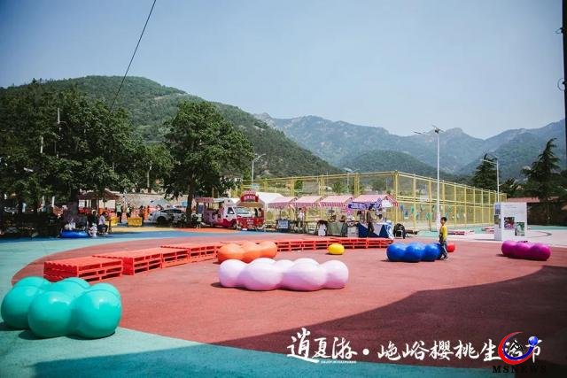 以本次“山色峪櫻桃生活節(jié)”舉辦場地為例——其作為山色峪美麗鄉(xiāng)村藝術計劃的一部分,通過原有硬件設施的改造,以及對場地的合理化改造和強視覺設計,將地面鋪裝用紅色、粉色、藍色、綠色等高飽和度的配色,以當地特產櫻桃為造型元素,通過大色塊組合設計,實現了功能性與藝術性的結合。于此同時,山色峪的重要公共空間、重要的節(jié)點,如山色峪入口、山墻、12座橋梁、文化廣場等,也進行了系統(tǒng)的色彩規(guī)劃和設計改造。借此,夏莊街道計劃通過建筑、公共設施的藝術性改造,為區(qū)域的發(fā)展承載更多的可能性,吸引更多游客感受在地性藝術體驗,激活鄉(xiāng)村振興文旅多樣性。