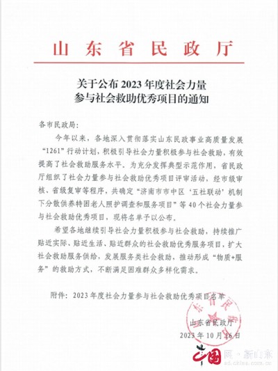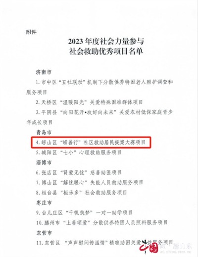 近日,山東省民政廳印發(fā)《關(guān)于公布2023年度社會(huì)力量參與社會(huì)救助優(yōu)秀項(xiàng)目的通知》,青島嶗山區(qū)“‘嶗善行’社區(qū)救助居民提案大賽項(xiàng)目”獲評(píng)全省“2023年度社會(huì)力量參與社會(huì)救助優(yōu)秀項(xiàng)目”。