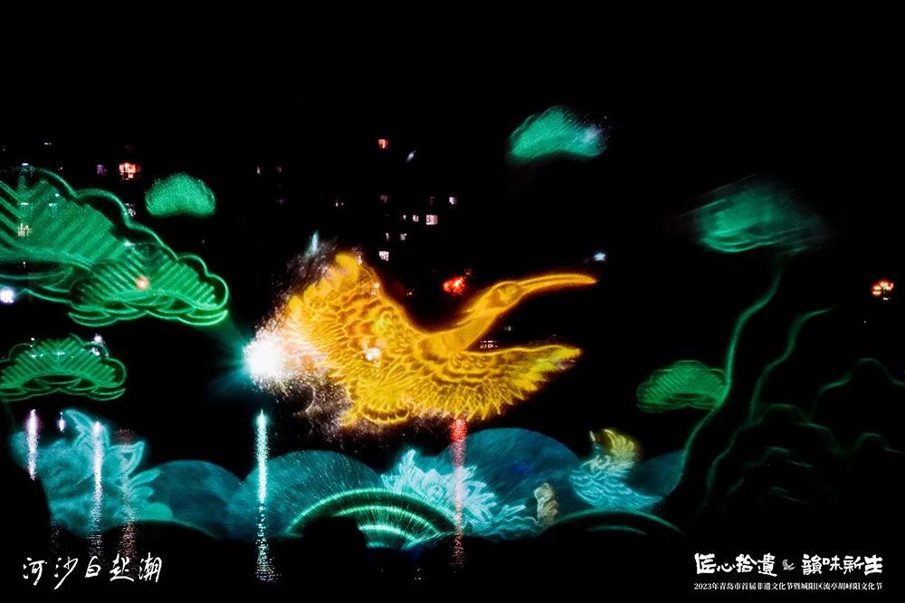 尤其顛覆想象的是,在非遺水陸光影秀《潮起白沙河》中,“非遺+藝術(shù)+科技”的組合模式,令人耳目一新,流連忘返——朱鹮、白鷺、文鰩魚(yú)、山、海、云、傳統(tǒng)書(shū)法等元素通過(guò)水幕光影的形式,為大眾營(yíng)造出超酷炫的夢(mèng)幻空間。