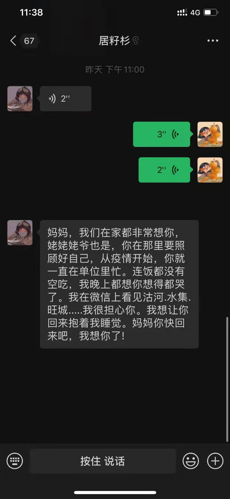 因疫情的原因,王茜在單位連軸運(yùn)轉(zhuǎn),已工作生活了近兩周時(shí)間,都說女兒跟媽媽最親,可她已經(jīng)忙到?jīng)]時(shí)間去想女兒,只能利用晚上工作間隙,匆匆跟女兒視頻見面,視頻中,女兒為不讓媽媽擔(dān)心,強(qiáng)忍著思念之情,聲聲地說著,媽媽不用擔(dān)心我,姥姥、姥爺把我照顧得很好......,可是淚水卻不自覺的流了下來,看見女兒流淚,她也終于控制不住自己,失聲痛哭起來。
