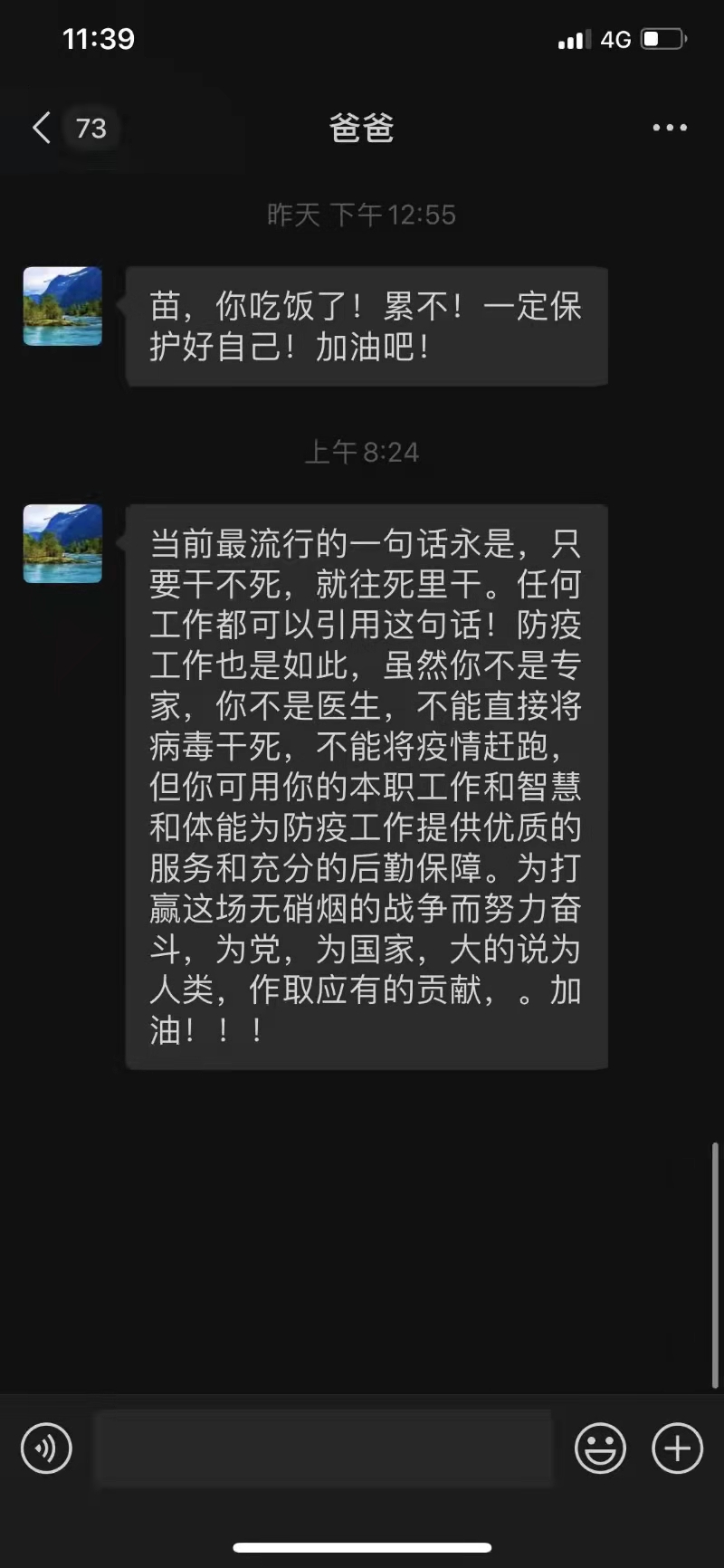 王茜的父親是一名退休老公安,典型的鋼鐵直男,給女兒發(fā)微信時(shí)說“當(dāng)前最流行的一句話就是,只要干不死,就往死里干。任何工作都可以引用這句話,防疫工作也是如此,雖然你不是專家,你不是醫(yī)生,不能直接將病毒干死,不能將疫情趕跑,但你可以用你的本職工作、智慧和體能為防疫工作提供優(yōu)質(zhì)的服務(wù)和充分的后勤保障。為打贏這場無硝煙的戰(zhàn)爭而努力奮斗,為黨、為國家,大的說為人類,作出應(yīng)有的貢獻(xiàn)。加油?。。?rdquo;都說“虎父無犬女”,他們父女之間的微信聊天,就是這句話最好的驗(yàn)證吧。