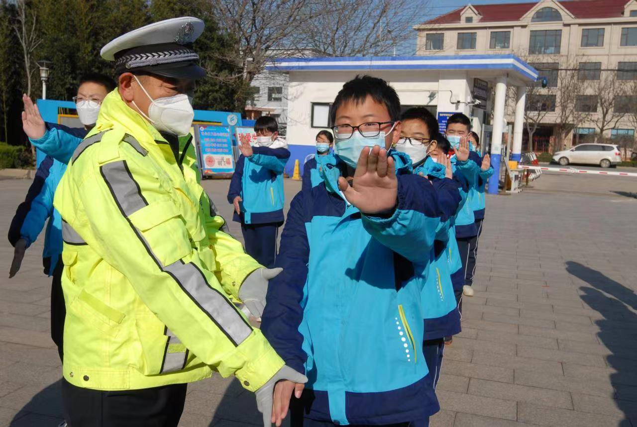12月1日,山東省青島市即墨區(qū)藍村中學學生在民警的引導(dǎo)示范下,學習交通指揮手勢。