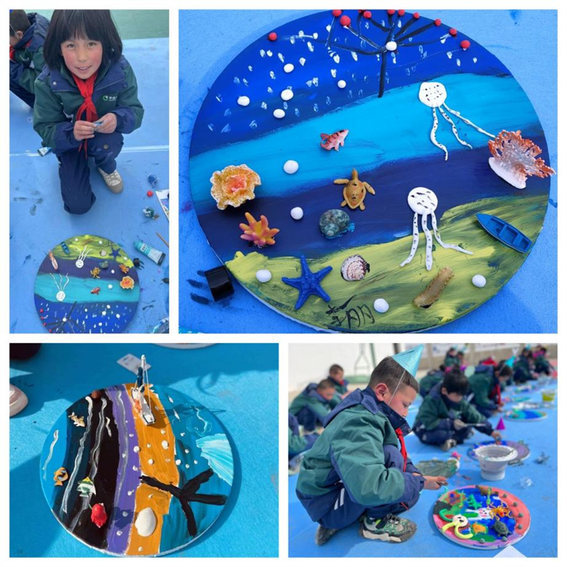 明媚的陽光下,小朋友們在操場席地而坐,拿著畫筆,用顏料涂出斑斕的海洋世界,用紙板制作千姿百態(tài)的海洋生物模型。