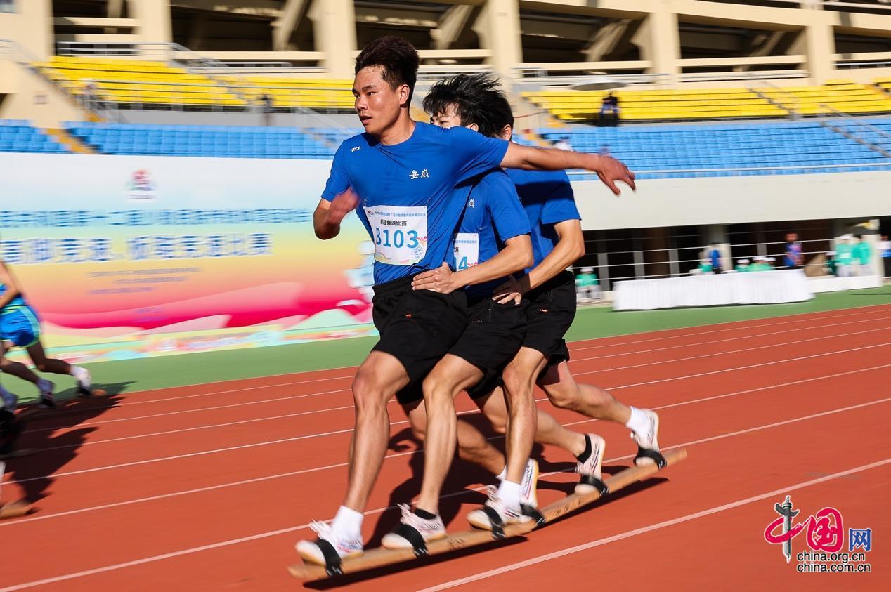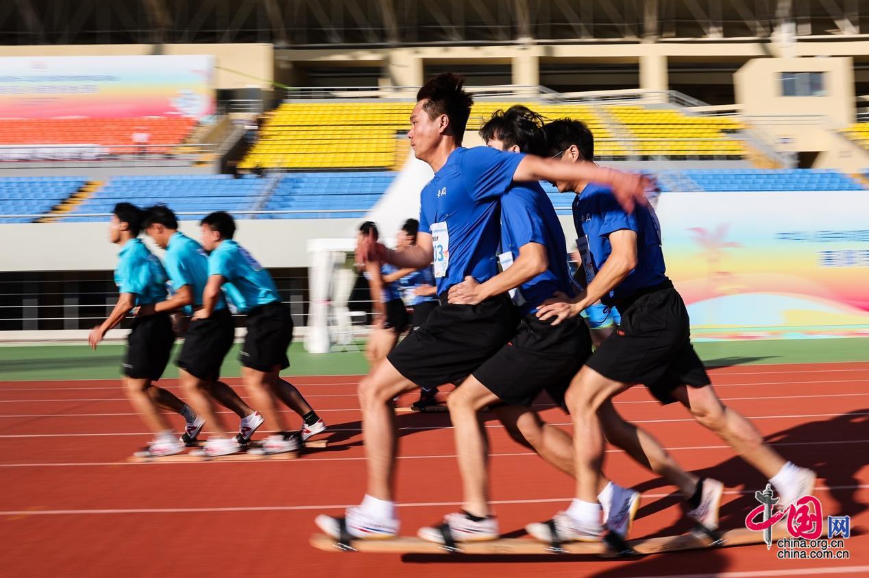 11月28日,第十二屆全國少數(shù)民族傳統(tǒng)體育運(yùn)動(dòng)會(huì)板鞋競(jìng)速比賽男子三人板鞋項(xiàng)目在海南省三亞技師學(xué)院體育場(chǎng)舉行。中國網(wǎng)記者 董寧 攝影