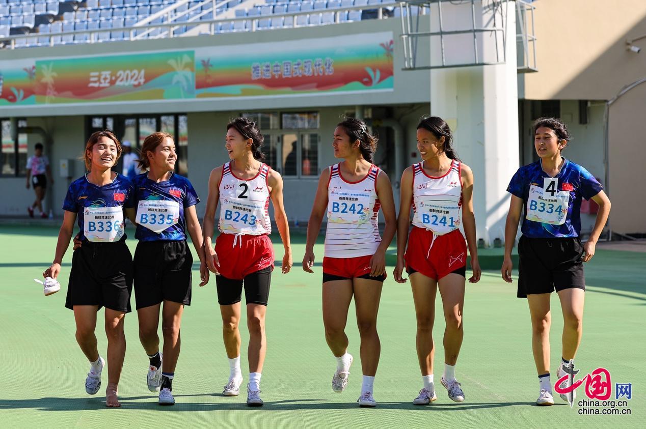 11月28日,第十二屆全國少數(shù)民族傳統(tǒng)體育運(yùn)動(dòng)會(huì)板鞋競(jìng)速比賽女子三人板鞋項(xiàng)目在海南省三亞技師學(xué)院體育場(chǎng)舉行。圖為湖南代表團(tuán)選手和貴州代表團(tuán)選手賽后相互祝賀。中國網(wǎng)記者 董寧 攝影