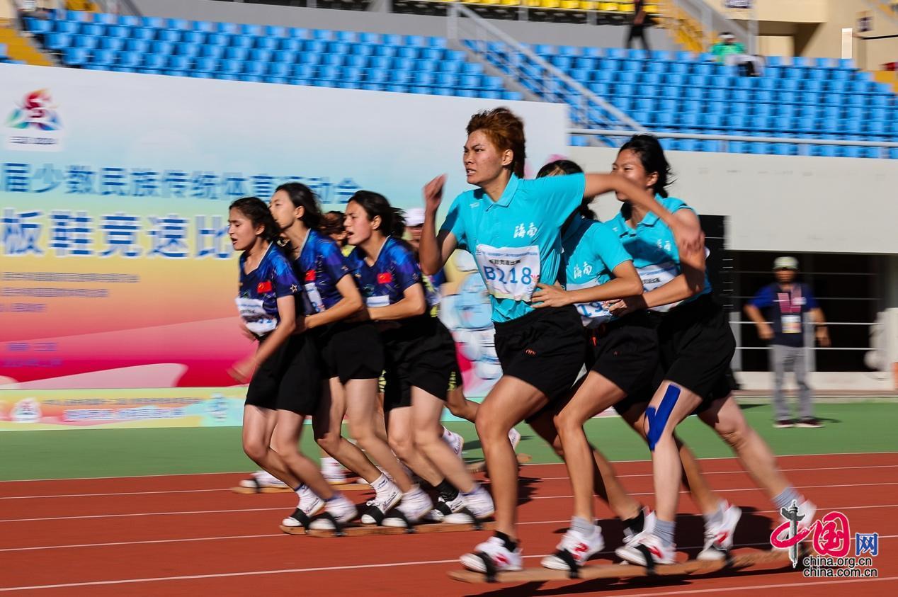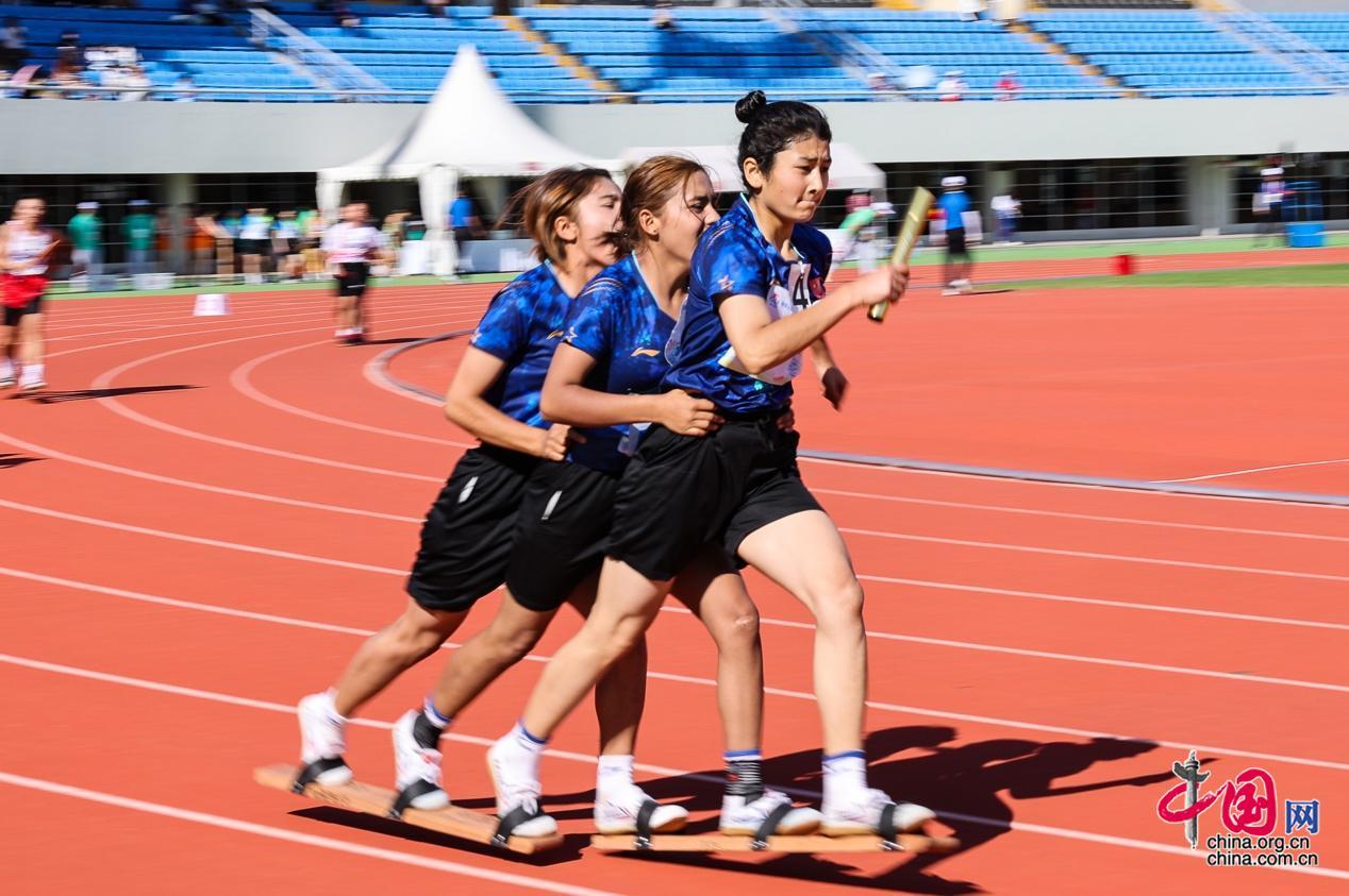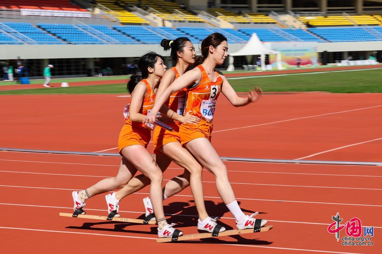 11月28日,第十二屆全國少數(shù)民族傳統(tǒng)體育運(yùn)動(dòng)會(huì)板鞋競(jìng)速比賽女子三人板鞋項(xiàng)目在海南省三亞技師學(xué)院體育場(chǎng)舉行。中國網(wǎng)記者 董寧 攝影