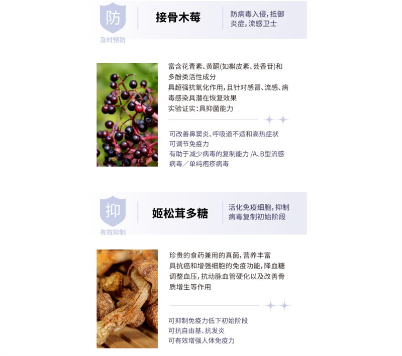 調(diào)查還發(fā)現(xiàn),該產(chǎn)品所含的種種成分也被官方公眾號包裝出了多種醫(yī)療作用,比如該產(chǎn)品含有的“接骨木莓”就被提示具有“可改善鼻竇炎、呼吸道不適和高熱癥狀”等功效。