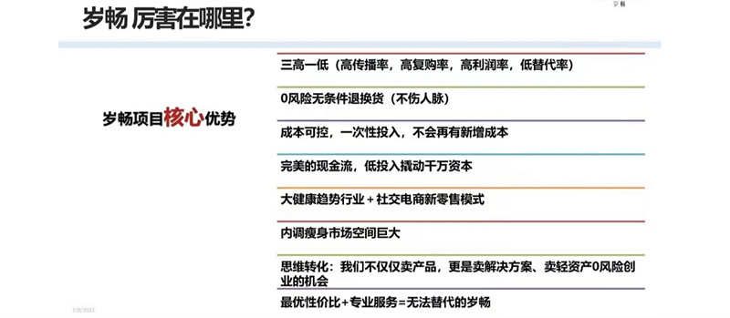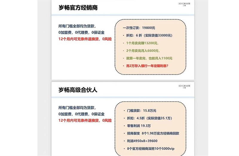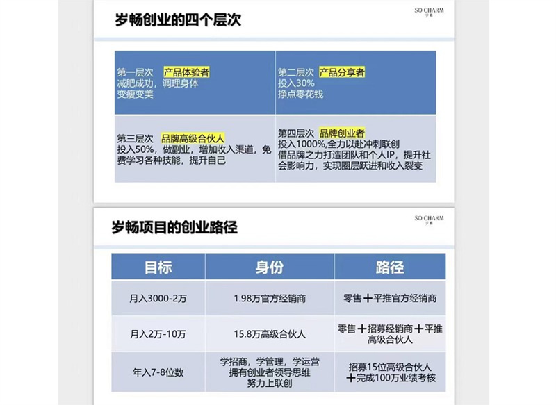 那么歲暢有著怎樣的公司背景?該品牌與屢屢被曝出涉嫌傳銷的森米、夢笙有何關(guān)聯(lián)?歲暢的兩位創(chuàng)始人艾小米和杜靈奕以往曾在森米和夢笙當中扮演過怎樣的角色?歲暢旗下的普通食品是否可以明示或暗示具有“提升免疫力、減肥”等保健功效?歲暢現(xiàn)行的四級代理模式該如何解讀?涉及到“0風險”和“最優(yōu)性價比”的廣告語是否合規(guī)?