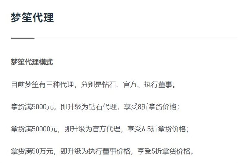文章的最后,我們不妨再來回顧一下森米和夢笙推行的獎金制度。起初,森米就將代理商主要分為三個級別:鉆石代理(首次8折后拿滿5000元產(chǎn)品)、官方代理(首次65折后拿滿5萬元產(chǎn)品)和執(zhí)行董事(首次5折后拿貨滿38萬元產(chǎn)品+押金2萬元),而在執(zhí)行董事之上,還有聯(lián)創(chuàng),也就是說,森米實際上推行的還是四級代理機制。成為森米代理后,參與者所收獲的利潤主要分為以下三個部分:第一,差價利潤;第二,返利利潤,推薦同級別代理,直屬上級會返40%的利潤,而且是終生返利;第三,跨級返利,獎勵升級門檻費用的5%。