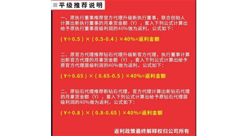 說到歲暢代理商的利潤來源,除了差價收益外,參與者還有平推獎可拿,官方的平級獎是8%,高級合伙人是6%。其實,在高級合伙人之上還有一個名叫“聯(lián)創(chuàng)”的隱藏級別,不過聯(lián)創(chuàng)的權(quán)益不對外公布,高級合伙人要想升級為聯(lián)創(chuàng),需要推薦15個高級合伙人,同時團隊業(yè)績達到100萬元。