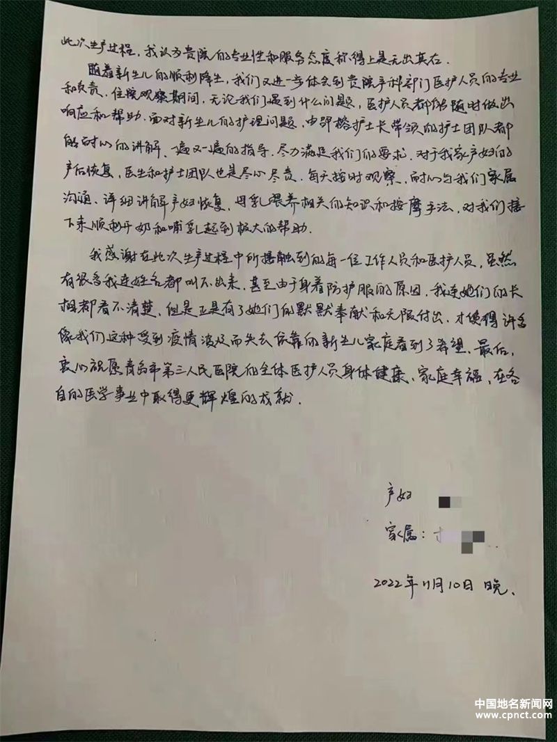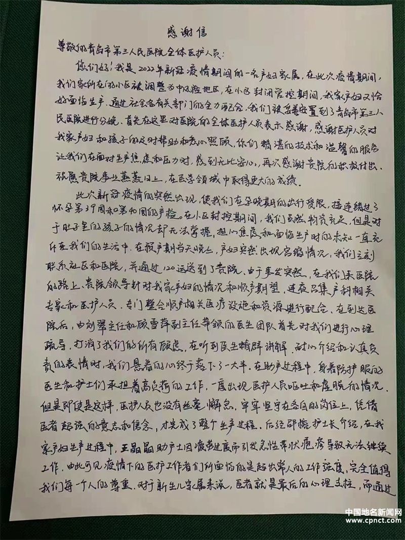 在11月初疫情突發(fā)期間,被封控小區(qū)的市北居民楊先生面對愛人即將臨產(chǎn)的情況向興隆路街道海岸路社區(qū)求助,在市北區(qū)疫情防控指揮部醫(yī)療救治組等有關部門的全力配合下,楊先生的愛人被妥善安置到青島市第三人民醫(yī)院,順利分娩。近日,楊先生向醫(yī)院送來他于11月10日晚寫下的一封感謝信。