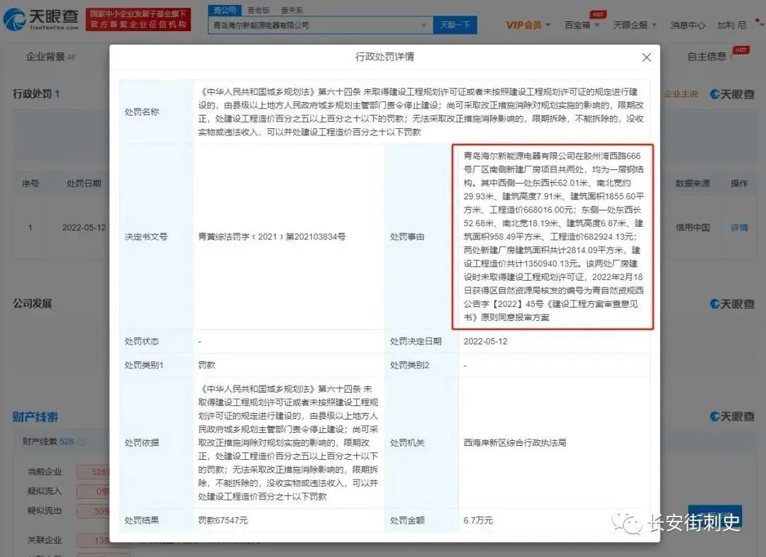 近日,青島海爾新能源電器有限公司因兩處廠房建設(shè)未取得建設(shè)工程規(guī)劃許可證,被西海岸新區(qū)綜合行政執(zhí)法局罰款約6.75萬(wàn)元。