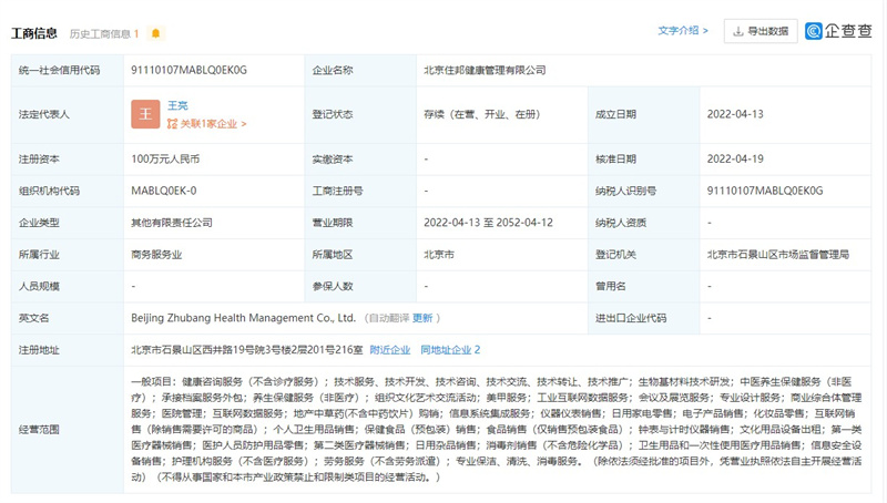 企查查APP顯示,北京住邦健康管理有限公司成立于2022年4月13日,注冊(cè)地位于北京市石景山區(qū)西井路19號(hào)院3號(hào)樓,注冊(cè)資本為100萬元,法定代表人為王某。王某擔(dān)任該公司總經(jīng)理,龍某宜擔(dān)任執(zhí)行董事,袁某高擔(dān)任監(jiān)事。該公司由北京住邦生物科技有限公司控股69%,北京九思九如健康產(chǎn)業(yè)管理有限公司持股10%,王某持股21%。北京九思九如健康產(chǎn)業(yè)管理有限公司便是九思九如集團(tuán)旗下公司之一。