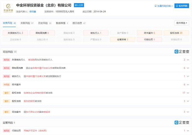 值得注意的是,中金環(huán)球投資基金集團(tuán)的主公司中金環(huán)球投資基金(北京)有限公司曾因執(zhí)行異議之訴案由被起訴3次;因未按時(shí)履行法律義務(wù)被法院強(qiáng)制執(zhí)行1次;因企業(yè)自身未履行法定義務(wù)被限制高消費(fèi)6次;因違反《中華人民共和國公司登記管理?xiàng)l例》(2016)第六十七條被行政處罰,吊銷執(zhí)照(登記證);涉及6起終本案件,被法院列為了失信被執(zhí)行人,凍結(jié)股東股權(quán)盒其他企業(yè)持有股權(quán)(其中就包含北京福安華生物科技有限公司)。
