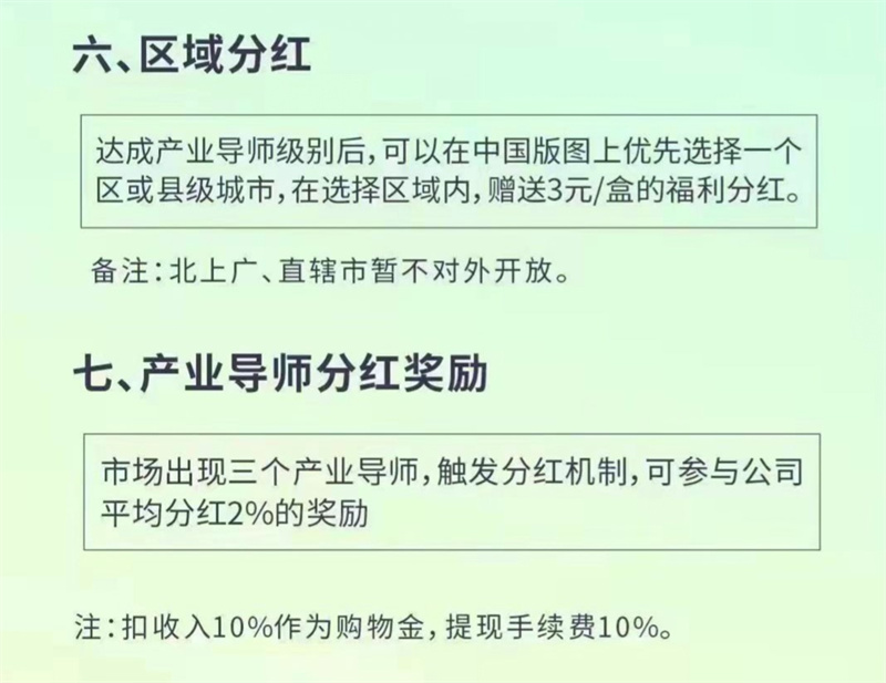 區(qū)域分紅獎(jiǎng)勵(lì):達(dá)成產(chǎn)業(yè)導(dǎo)師級(jí)別后,可以在中國版圖上優(yōu)先選擇一個(gè)區(qū)或縣級(jí)城市(除北上廣、直轄市以外),在選擇區(qū)域內(nèi),每銷售一盒產(chǎn)品,都可以獲得3元/盒的福利分紅。