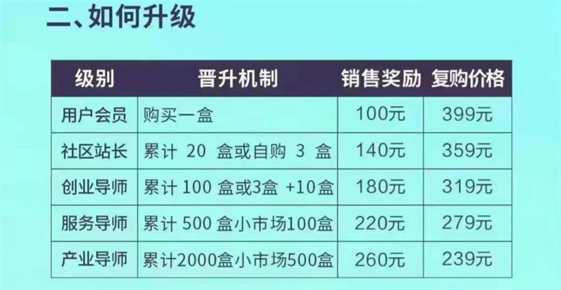 用戶會(huì)員: 購買一盒產(chǎn)品即可晉升為用戶會(huì)員。用戶會(huì)員享受399/盒的復(fù)購價(jià)格,銷售一盒產(chǎn)品可獲得499-399=100元銷售獎(jiǎng)勵(lì)。