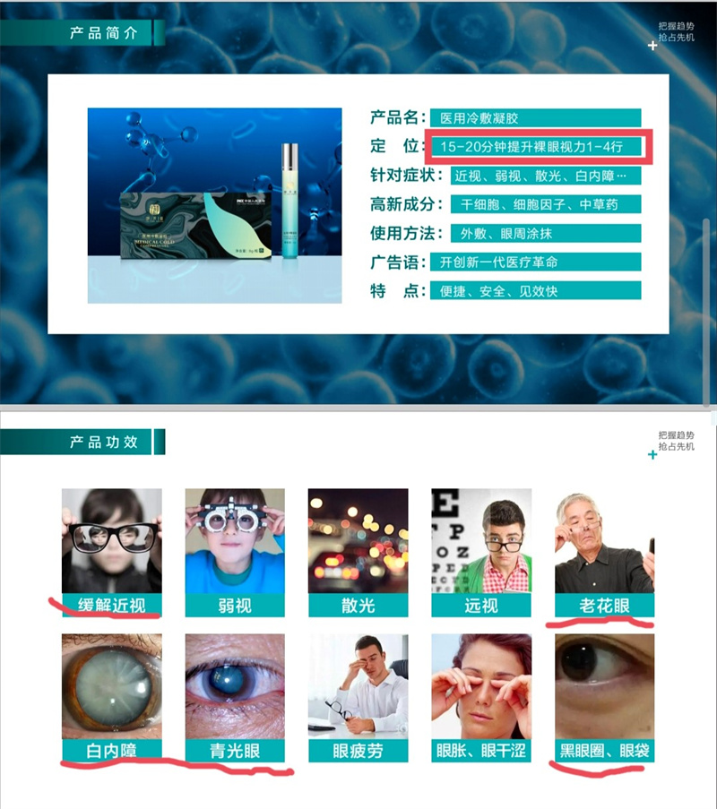 據(jù)代理介紹,“御京盛·醫(yī)用冷敷凝膠”含有密蒙花、谷精草、決明子、野菊花、蒲公英、人工牛黃、薄荷腦、冰片八大核心成分,運(yùn)用干細(xì)胞恒溫存貯技術(shù),中草藥和細(xì)胞因子共同作用,改善、抗衰。產(chǎn)品頭部采用滾珠設(shè)計(jì),只需要打開蓋子,順著眼眶周圍涂抹,然后閉眼休息15分鐘,就可以提升裸眼視力1-4行,緩解眼脹、眼干澀,有效治療近視、弱視、散光等病癥,去除黑眼圈、眼部細(xì)紋、改善青光眼、白內(nèi)障、老花眼、飛紋眼等眼疾。但該產(chǎn)品的效果真的有其所宣傳的那么神奇嗎?