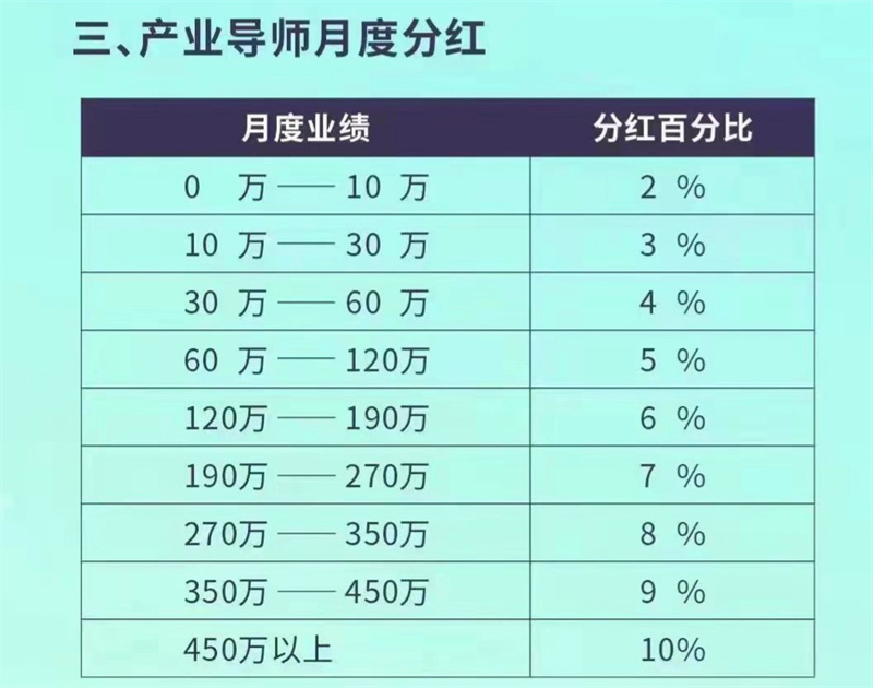 團(tuán)隊(duì)業(yè)績(jī)分紅獎(jiǎng)勵(lì):產(chǎn)業(yè)導(dǎo)師的團(tuán)隊(duì)月總業(yè)績(jī)?cè)?~10萬之間,可獲得團(tuán)隊(duì)月總業(yè)績(jī)2%的分紅;團(tuán)隊(duì)月總業(yè)績(jī)?cè)?0~30萬之間,可獲得團(tuán)隊(duì)月總業(yè)績(jī)3%的分紅;團(tuán)隊(duì)月總業(yè)績(jī)?cè)?0~60萬之間,可獲得團(tuán)隊(duì)月總業(yè)績(jī)4%的分紅;團(tuán)隊(duì)月總業(yè)績(jī)?cè)?0~120萬之間,可獲得團(tuán)隊(duì)月總業(yè)績(jī)5%的分紅;團(tuán)隊(duì)月總業(yè)績(jī)?cè)?20~190萬之間,可獲得團(tuán)隊(duì)月總業(yè)績(jī)6%的分紅;團(tuán)隊(duì)月總業(yè)績(jī)?cè)?90~270萬之間,可獲得團(tuán)隊(duì)月總業(yè)績(jī)7%的分紅;團(tuán)隊(duì)月總業(yè)績(jī)?cè)?70~350萬之間,可獲得團(tuán)隊(duì)月總業(yè)績(jī)8%的分紅;團(tuán)隊(duì)月總業(yè)績(jī)?cè)?50~450萬之間,可獲得團(tuán)隊(duì)月總業(yè)績(jī)9%的分紅;團(tuán)隊(duì)月總業(yè)績(jī)超過450萬,可獲得團(tuán)隊(duì)月總業(yè)績(jī)10%的分紅。