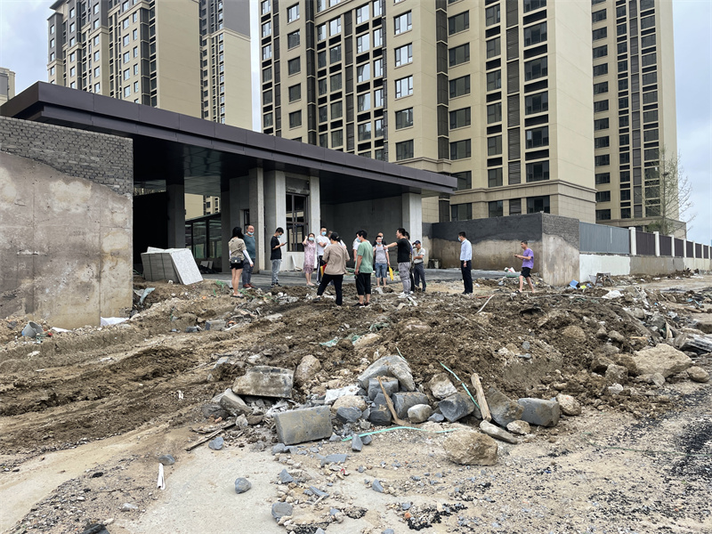 7月3日,調(diào)查員來(lái)到錦繡天地小區(qū),小區(qū)內(nèi)聚集了很多業(yè)主,門口道路坑坑洼洼泥濘不堪,部分建筑垃圾堆積在門口,車輛根本無(wú)法進(jìn)入地下停車場(chǎng),小區(qū)內(nèi)十分臟亂,有工作人員正在緊張的施工當(dāng)中,部分地磚、草皮還未鋪設(shè),小區(qū)內(nèi)路燈處只有一根電線裸露在外面,路燈還未安裝,瀝青地面凹凸不平,部分古力井蓋破損十分危險(xiǎn),樓內(nèi)布滿灰塵與垃圾無(wú)人清理,且樓道內(nèi)消防設(shè)施沒(méi)有接水管,有一定安全隱患,部分電梯還無(wú)法使用。