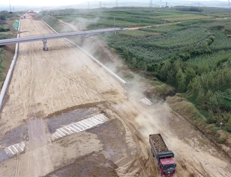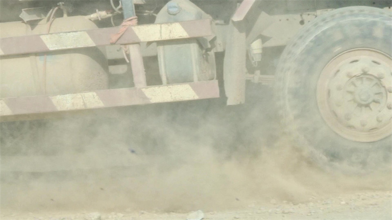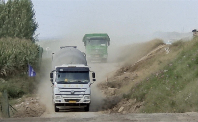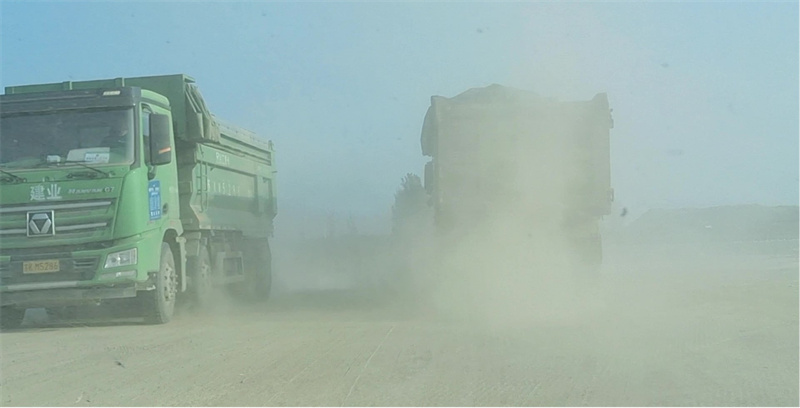 尤其是炭井村西側(cè)向南的部分路段,車(chē)輛輪胎碾壓路基塵土,發(fā)出“噗噗”的聲響,車(chē)輛經(jīng)過(guò),卷起的塵土遮天蔽日。高處眺望,工地上是一片狼煙。