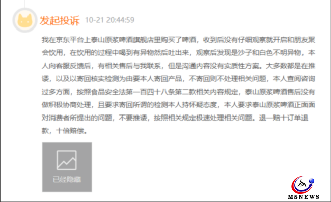 一位消費(fèi)者2月8日投訴稱,購買泰山啤酒,商品污染嚴(yán)重,只有半瓶,缺斤少兩,涉嫌欺詐消費(fèi)者,投訴無門,無人管。其后該消費(fèi)者補(bǔ)充了3次投訴信息,截至目前,該投訴僅停留在3月21日的泰山原漿啤酒回復(fù),該條投訴仍在繼續(xù)。