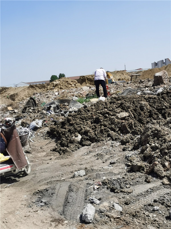 為核實事情的真?zhèn)?,本網(wǎng)工作人員驅車前往淄川賈村社區(qū)。根據(jù)報為人指定的位置,在賈村社區(qū)污水處理廠對面,有一塊占地大約八十畝的施工現(xiàn)場,現(xiàn)場有挖掘機在挖土作業(yè),有大量篩好的沙石在旁邊堆放,不時有大型車輛出入痕跡。而讓調查員感覺詭異的是,施工現(xiàn)場咋會垃圾遍地?現(xiàn)場還有一位撿垃圾的大爺,據(jù)其介紹,這些垃圾都是從外面拉過來的,填在他們挖走的土坑里,他感覺有些有用,準備撿回去賣破爛!