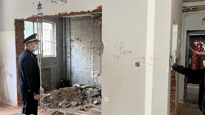 經(jīng)入戶查看,現(xiàn)場(chǎng)有多處墻體被砸,破壞較為嚴(yán)重。經(jīng)向現(xiàn)場(chǎng)施工人員詢問(wèn)相關(guān)情況,執(zhí)法人員取得業(yè)主的聯(lián)系方式,隨即撥打電話與業(yè)主進(jìn)行溝通,告知其破壞承重墻的危害性,并要求其限期一周內(nèi)恢復(fù)墻體。因疫情原因,在北京居住的業(yè)主暫時(shí)不能回青,在電話溝通中業(yè)主表示配合工作,將盡快安排人員將承重墻進(jìn)行恢復(fù)。一周過(guò)后,執(zhí)法人員再次聯(lián)系該業(yè)主并現(xiàn)場(chǎng)進(jìn)行查看,發(fā)現(xiàn)該業(yè)主已將破壞的墻體進(jìn)行了恢復(fù)并進(jìn)行加固。